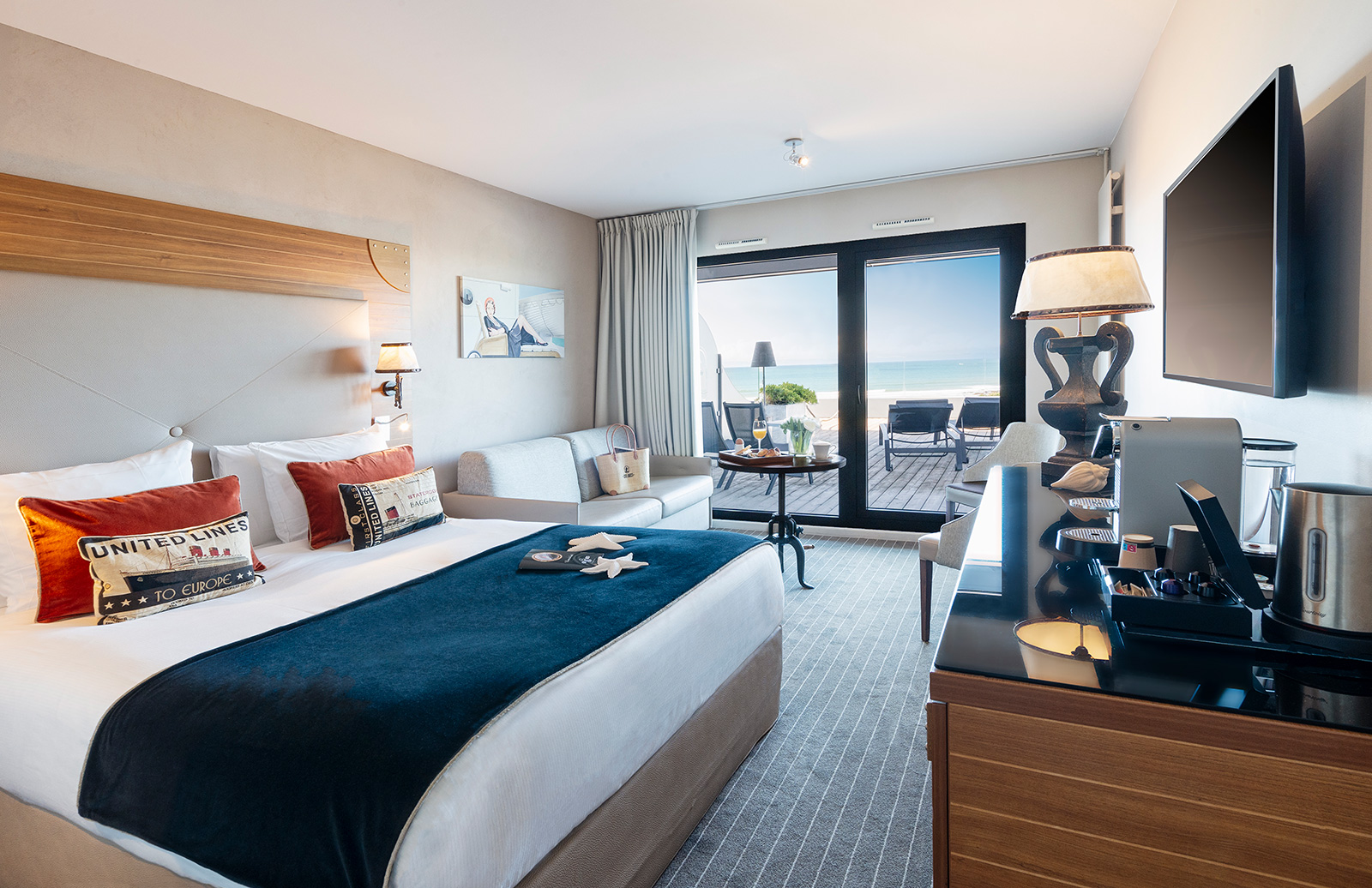 Cet établissement à taille humaine, offre un accueil personnalisé. Revisité et décoré dans le style paquebot des années 30, il y règne une ambiance cosy et chaleureuse. 97 chambres confortables aux couleurs douces, toutes avec terrasse ou balcon s’ouvrant sur la pinède ou l’océan. Elles sont équipées de téléphone direct, TV écran plat, WiFi gratuit, minibar, plateau de courtoisie avec Machine Nespresso, coffre-fort, sèche-cheveux. Salle de bains avec douche à l’italienne s’ouvrant sur la chambre grâce à ses persiennes.